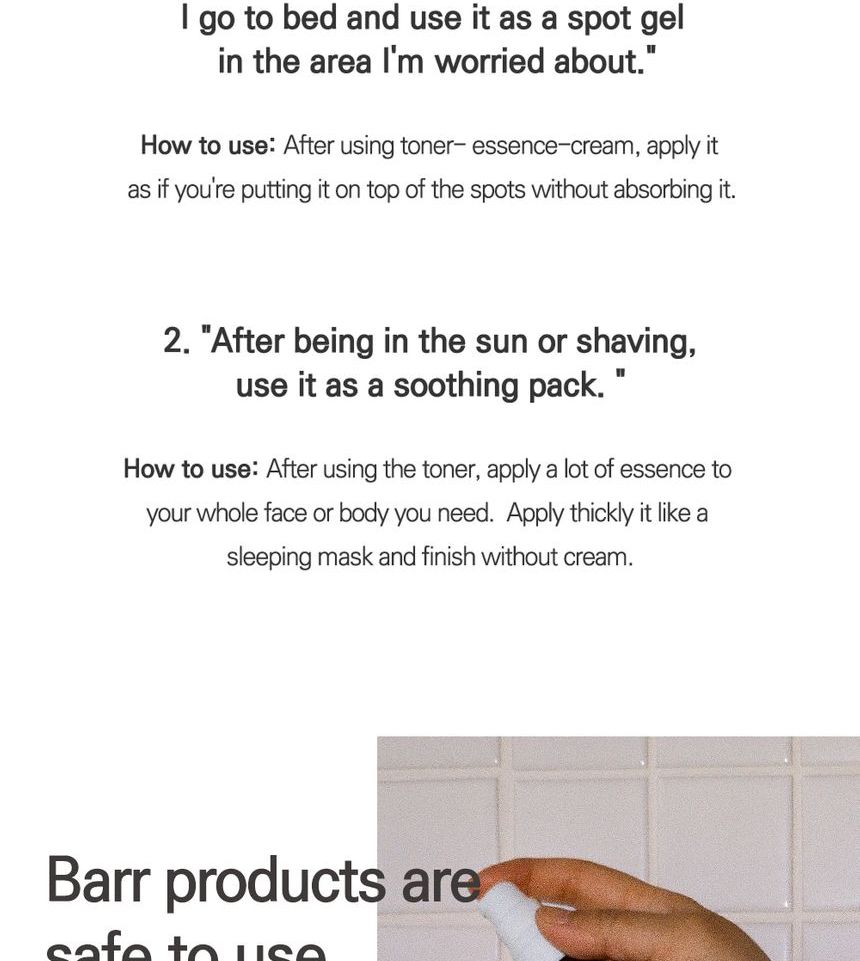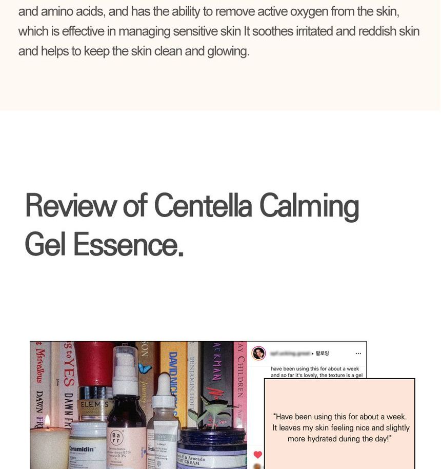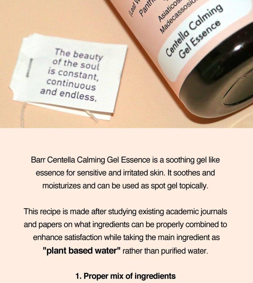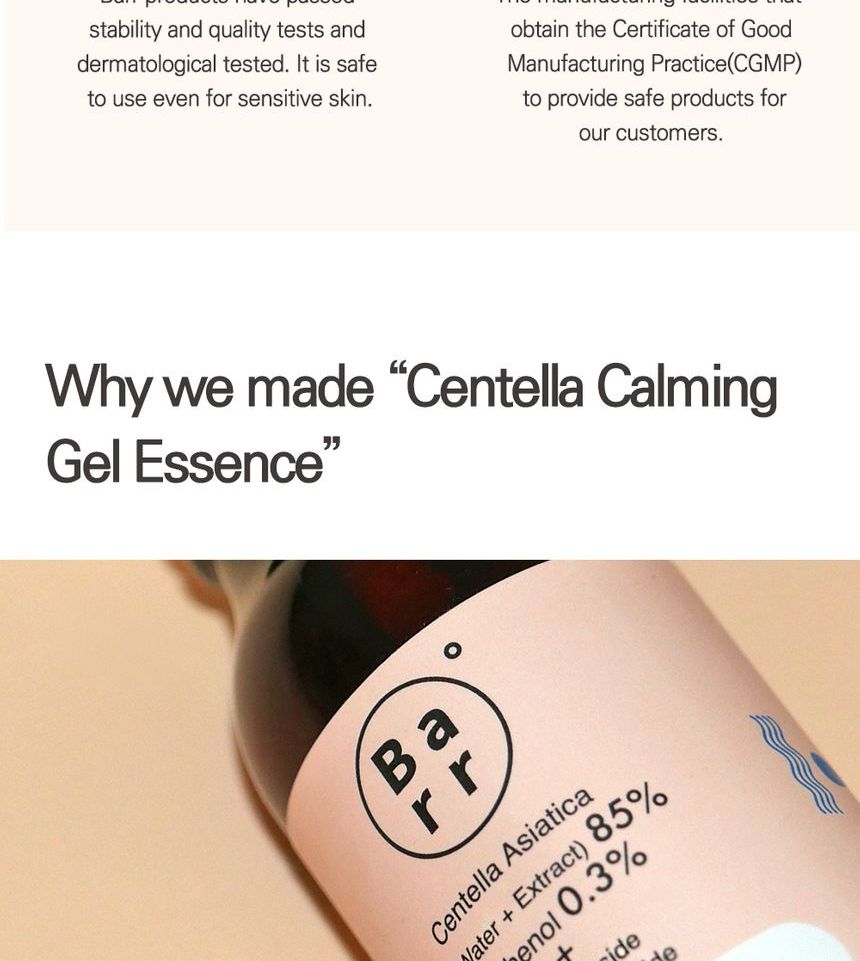 L'essenza di gel calmante di Barr Centella è un'essenza di gel acquosa per aiutare a lenire la pelle irritata e sensibile. È ricco di 85% di Centella asiatica e 0,3% di pantenolo per calmare e idratare profondamente la pelle. Questa essenza idratante contiene anche Houttuynia cordata per lenire il rossore e la pelle incline all'acne, mentre l'olio di semi di jojoba aiuta a controllare la secrezione di sebo per una pelle più sana e calma.
