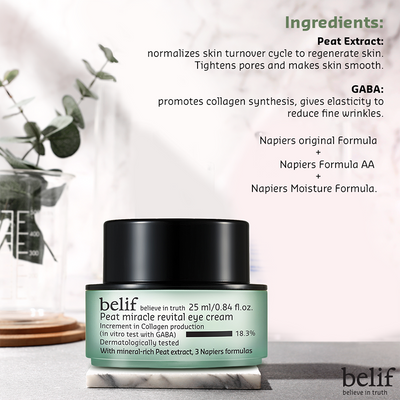 Scopri il segreto degli occhi radiosi e giovanili con la crema per gli occhi del miracolo della torba di Belif. Questa lussuosa crema per gli occhi sfrutta il potere dell'estratto di torba ricco di antiossidanti e della tecnologia avanzata per svelare gli occhi immediatamente ringiovaniti. arricchito con l'acqua di torba a base di erbe della Finlandia, nota per i suoi abbondanti minerali e acidi organici, migliora l'elasticità della pelle mentre si riduce visibilmente linee sottili e rughe. Respirare la vita in una pelle stanca e opaca. La formula ricca e vellutata si assorbe rapidamente, lasciando la delicata area oculare liscia e paffuta. Per uno sguardo più giovane e vibrante, lascia che la crema per gli occhi di Belif sia la tua arma segreta.