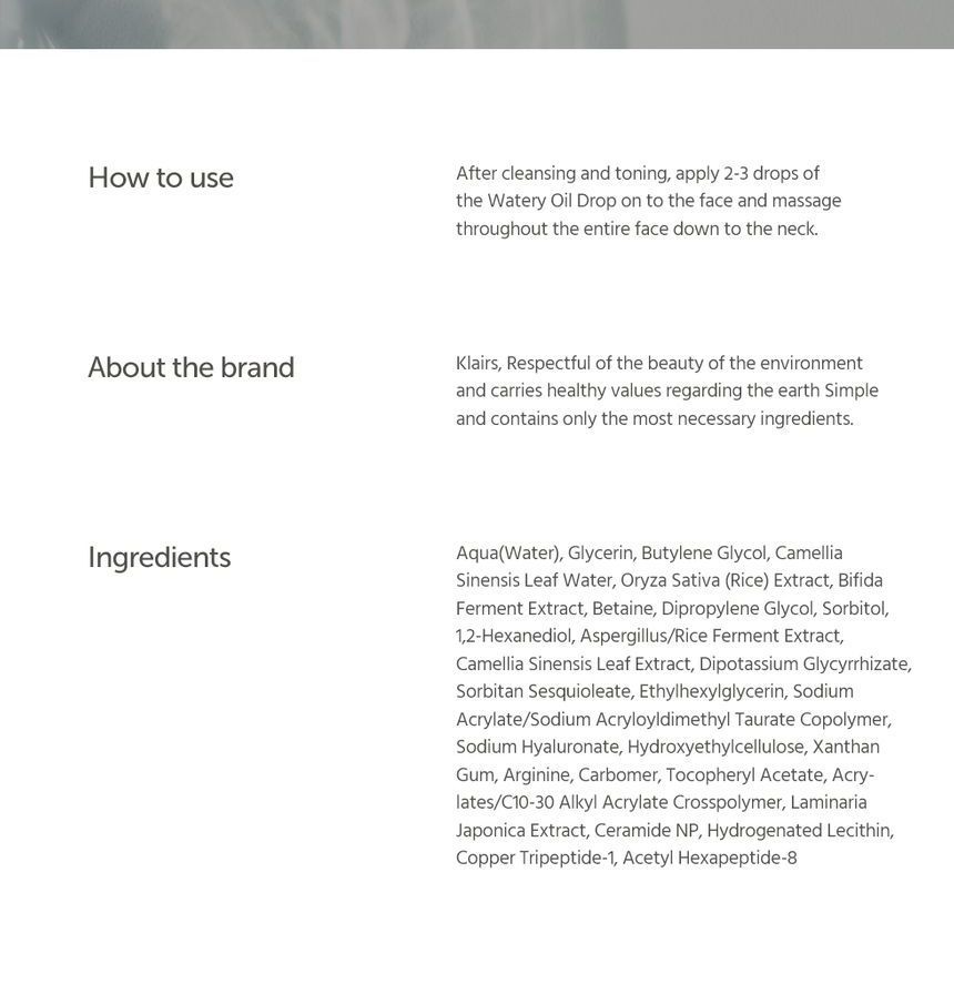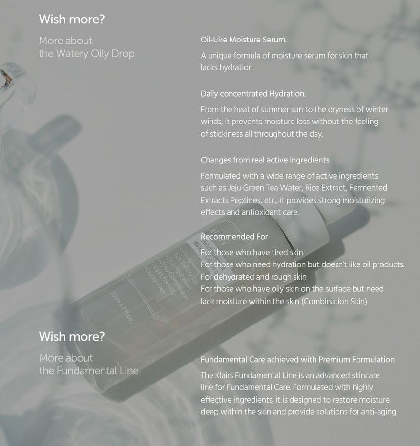 La goccia di olio acquoso fondamentale dei Klairs è un siero a base d'acqua che idrata la pelle come un olio per il viso. Questo siero non appiccicoso e facilmente assorbibile è raccomandato per le persone che desiderano tutti i benefici di un prodotto petrolifero senza la finitura grassa o grassa. Formulato con tè verde, estratti di fermento, ceramide e peptidi, questo siero ricco di antiossidanti migliora la rigenerazione della pelle e funge da soluzione antiaging.