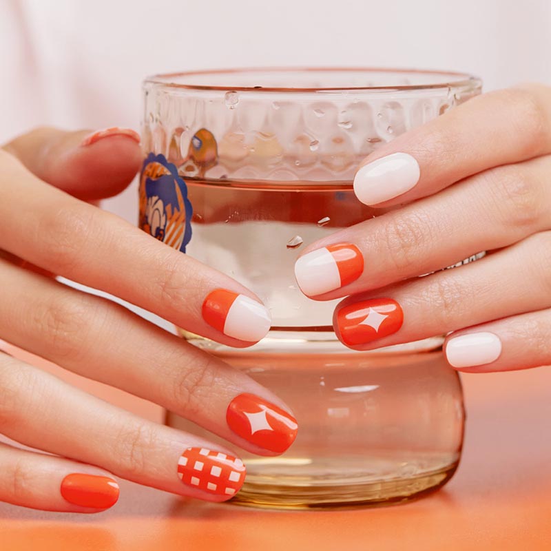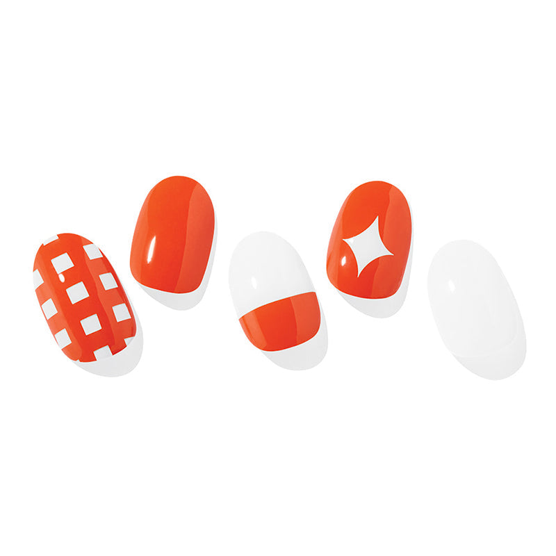 illumina le unghie con la manicure del gel di mandarino Ohora n, ispirata alle vibranti tonalità di mandarini freschi. Questo set vivace combina audace gel bianco arancione e croccante in motivi a scacchi giocosi e motivi a stella, aggiungendo un divertente pop di colore e stile alle dita. Perfetto per coloro che desiderano un aspetto alla moda e accattivante, questa manicure in gel facile da applicare offre un tocco fresco e fruttato che sicuramente si distinguerà.